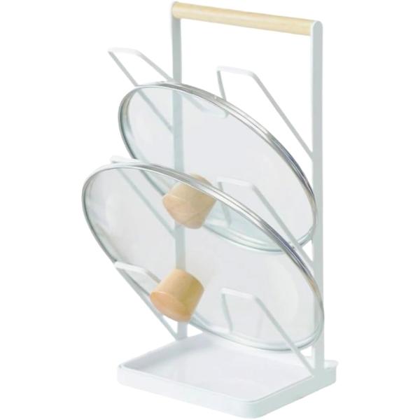 自立するタイプの鍋蓋スタンド。フレームは火や傷に強い鉄製なので、キッチンに置いておくのも安心です。木目調のハンドルが見た目のアクセントになります。底部には水切りトレイ付きで、蓋の水滴を受け止めてくれますよ。鍋蓋のほか、まな板やおたま、菜箸などの道具置きとしても活用できます。