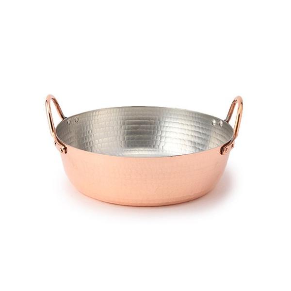 サイズ:内径26.5×高さ8.5m、最大幅(取っ手含む):約28cm、取っ手高さ:約5cm、板厚:2mm 重量:約1.8kg 仕様/対応熱源:ガス火(IH非対応)、食洗機使用:不可 材質:銅