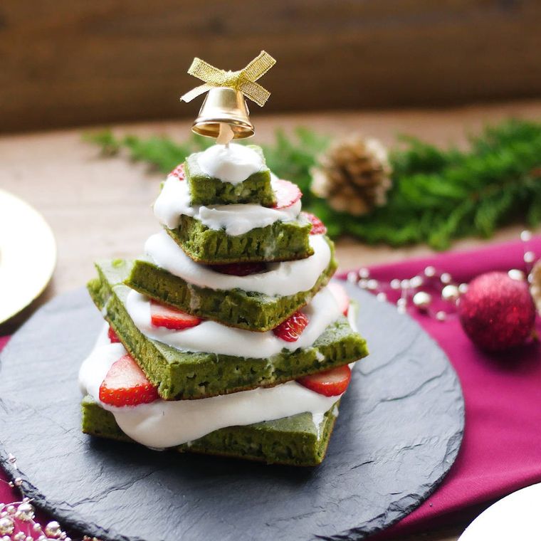 かわいらしいミニサイズのツリーは、みんなの注目を集めますよ。抹茶で緑色にするホットケーキを、もみの木に見立てましょう。生地にホワイトチョコチップを入れるので、抹茶のほろ苦さと相まって絶妙な味わいに。お好みでアラザンをトッピングすると、キラキラのクリスマスツリーができあがります。
