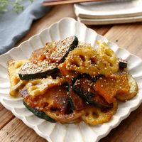 フライパンにサラダ油を深さ1cm入れて170℃に熱し、れんこんを入れてうっすらと揚げ色がつくまで揚げ焼きし、続けてぶりも揚げ色がつくまで揚げ焼きします。