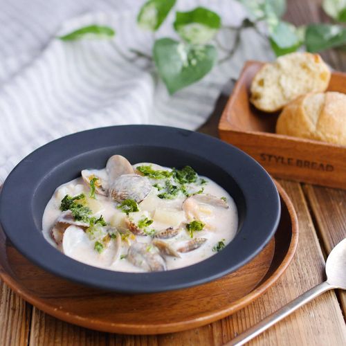 お味噌汁やお吸い物だけでなく、アサリは洋風のスープでも大活躍します。こちらは牛乳を加えて作るミルクスープのレシピです。昆布茶を入れることで、ほんのり和風のテイストがプラス、意外なあおさや明太子の組み合わせもよく合うようになるんです。