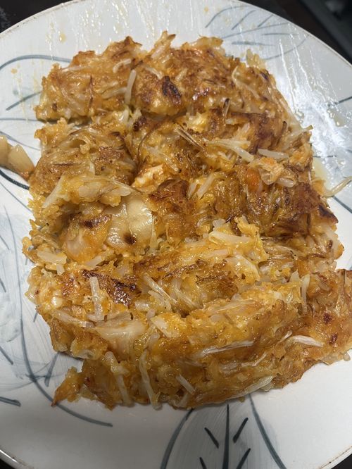 フライパンにごま油を熱し、①を流し入れて中火で5分ほど焼き、生地の周りが色づいてきたら裏返します。