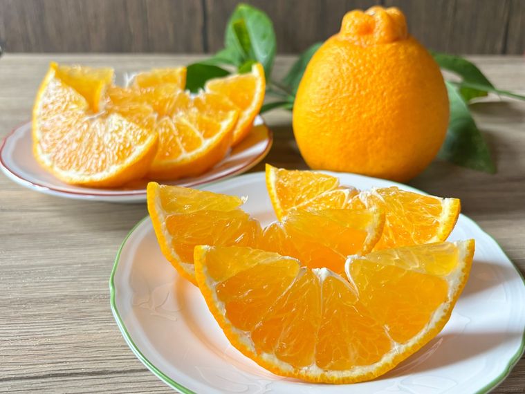 艶のある橙色の厚い皮が特徴で、果肉は粒が大きく、やわらかくて多汁です。しっかりとした甘みながら酸味もほどよく、濃厚な味わいが人気ですよ。