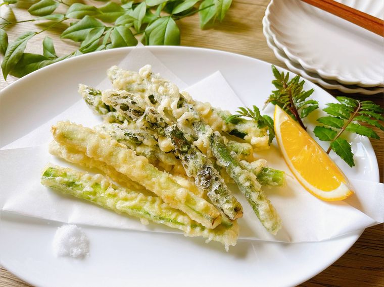 5. フライパン・鍋に油を注ぎ、170~180℃まで温めます。鶏胸肉を衣にくぐらせて4分ほど揚げて、こんがりきつね色になったらOK!そのままでも、天つゆやポン酢と一緒に食べてもおいしいですよ。