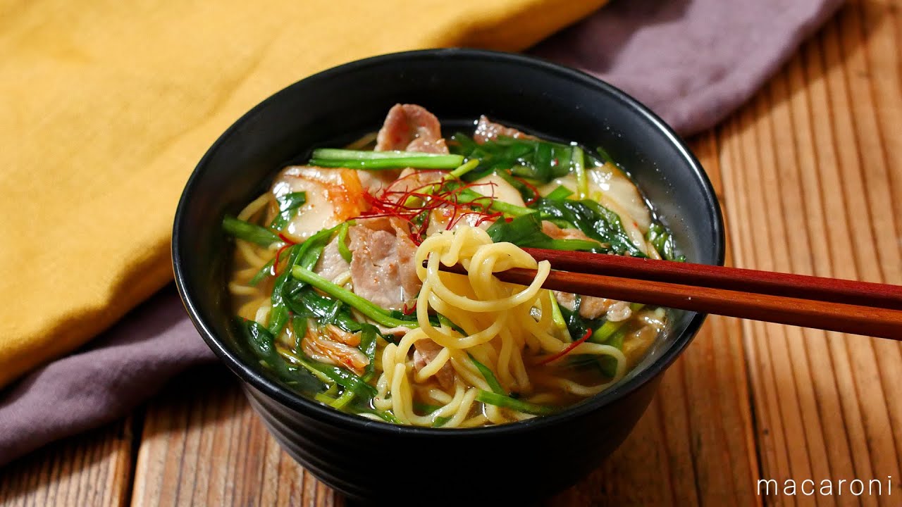 白菜キムチでピリ辛に仕上げる豚バラ肉やニラを中華麵の上にたっぷりのせます。より辛さがほしい方は白菜キムチを増やしてくださいね。にんにくを効かせるスープが麺に絡むスタミナ満点のラーメンです。