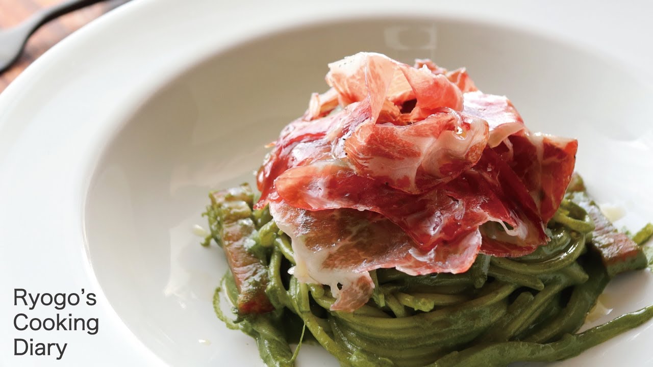 パスタを盛り付けたら、生ハムをたっぷりトッピング。噛めば噛むほど旨みが溢れる生ハムは、抹茶のほろ苦さと絶妙な相性を発揮してくれますよ。