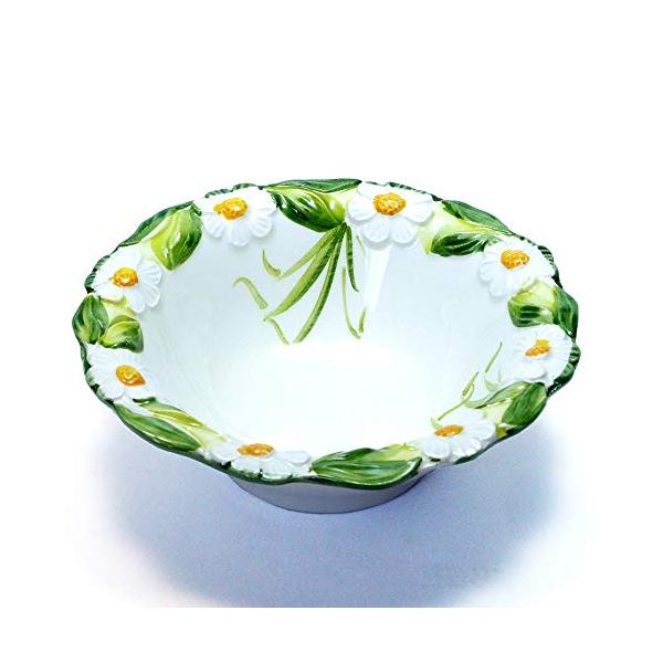 イタリア・バッサーノ地方で作られたこれぞヨーロッパデザイン!といったたたずまいの明るい色のサラダボウル。白が基調で縁取りはマーガレットのレリーフで清潔感があり、グリーンサラダを入れると一体感が出ますね。ハンドペイントなのでやさしい雰囲気があり、テーブルを華やかに演出できます。