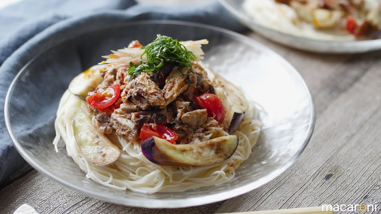 具だくさんで食べ応えのあるそうめんなら、ひと皿で満足感が得られます。ランチやサッと済ませたい夕食におすすめ。大葉やみょうがはお好みでトッピングしてくださいね。さば缶のコクとピリ辛の味付けがよく合います。