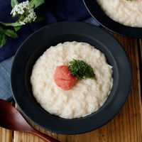 4. 取り出して器に盛り付け、明太子と梅干しをそれぞれ2本ずつのせて完成