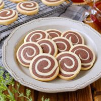くるくるとかわいい柄のクッキーがたくさん作れます。生地が厚いと巻きづらいので、薄めに広げましょう。巻く前に、生地同士がずれていかないように麺棒でころころと密着させるのがポイントです。巻くときには、空洞ができないようしっかりと巻いてくださいね。