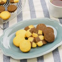 アイスボックスクッキーの定番レシピです。市松模様の生地を4等分する際、なるべく同じ大きさになるように切ってください。生地を重ね合わせたらしっかり冷蔵庫で休ませるのがコツ。量産できるので、バレンタインの友チョコ作りにぴったりですよ。