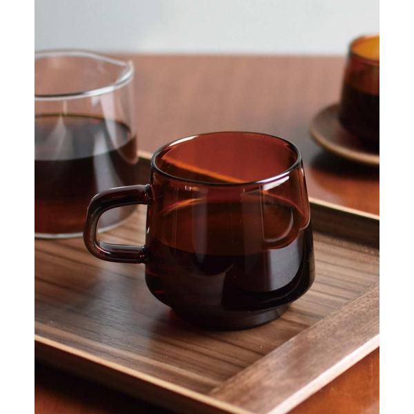 透明な褐色と、丸みを帯びたフォルムが美しいマグカップ。ハンドルは、指が滑りにくいように、四角い形にデザインされているんですよ。
