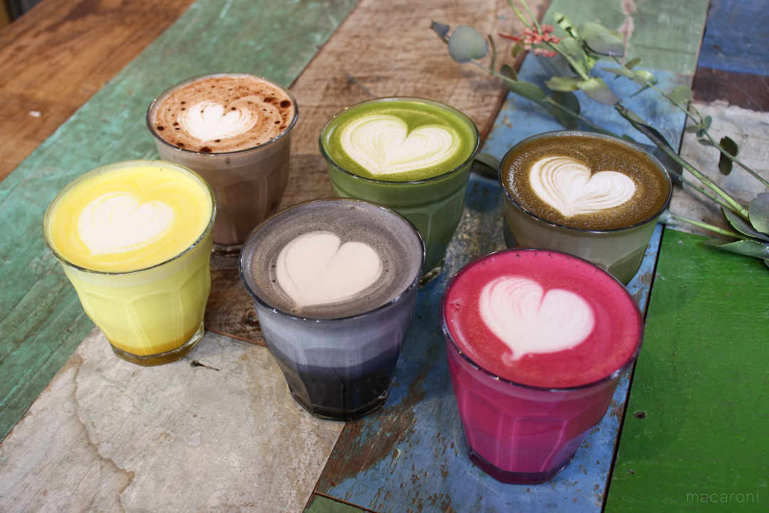 左上から時計回りに ラテ・ショコラ ラテ・マッチャ ラテ・ホウジチャ ラテ・レッドビーツ ラテ・バンブーチャコール ラテ・ターメリックジンジャー:各600円(税込)