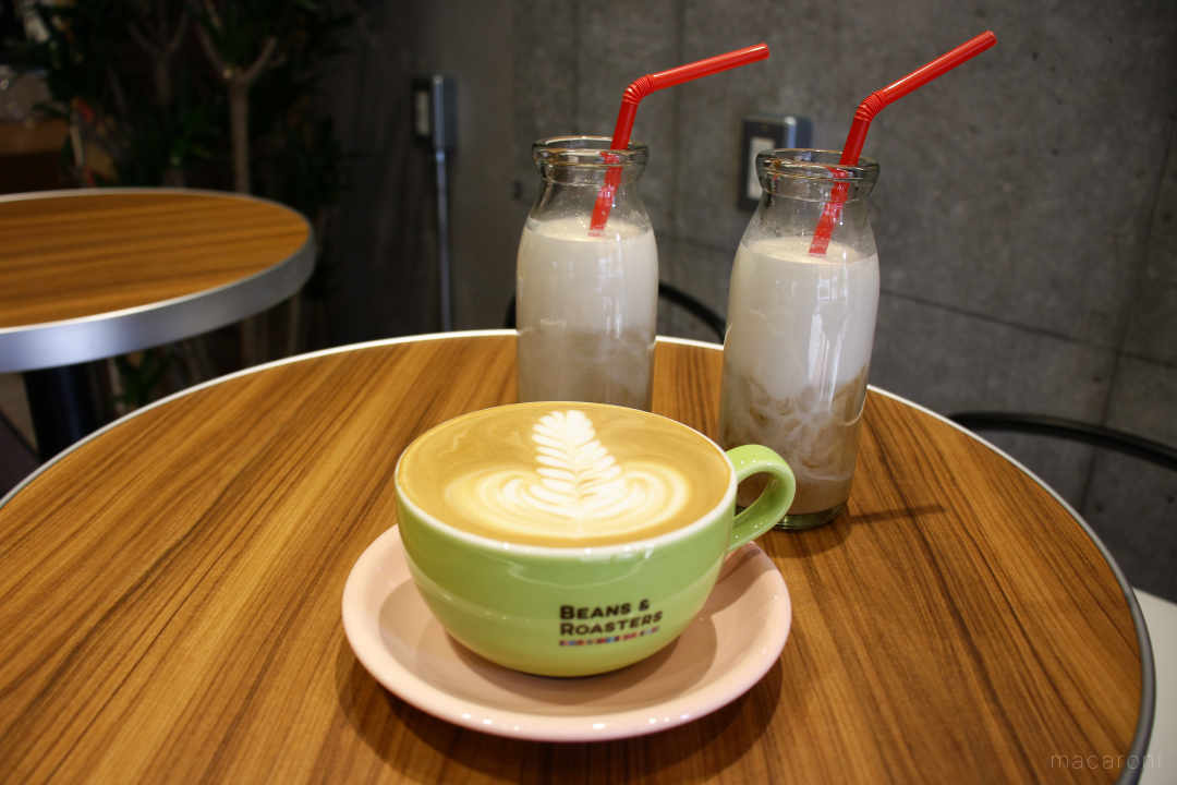 前 カフェラテ(有機牛乳大地牧場・千葉、エチオピアシャキッソ豆使用):650円(税込) 奥 カフェラテ(有機アーモンドミルク、B&Rハウスブレンド使用):650円(税込)