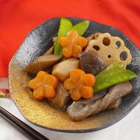 れんこん・絹さや・手綱コンニャク・ごぼう・飾り切りニンジン・さといも・しいたけが入った筑前煮