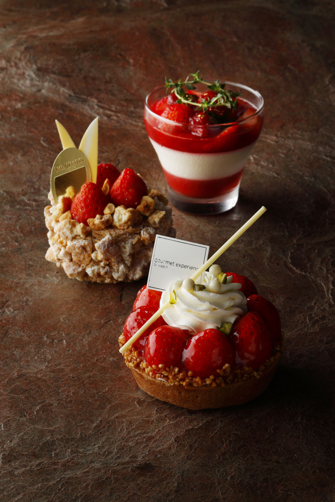 苺のブラマンジェ(上)、プラリネと苺のシュクセ(中)、タルトフレーズ(下)