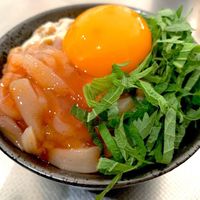 イカ明太と大葉がのったな納豆卵かけご飯