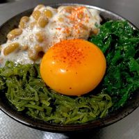 モロヘイヤとめかぶがのった納豆卵かけご飯