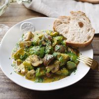アボカドとマッシュルームがごろごろ、パンが添えられている