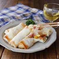 皮の中からお餅が伸びている、カルボナーラ春巻き