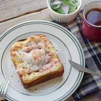 緑のフチがついたお皿・カトラリーに、カルボナーラトースト