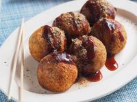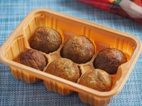 茶色いトレーに6個並んだ銀だこのたこ焼