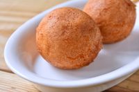 加熱して皿に盛ったひょうたん揚げと、冷凍ひょうたん揚げ、箱