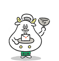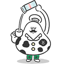 うし柄のシャツを着て牛乳を注ぐ白いFoodieくん