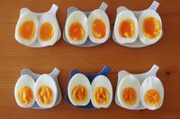 ゆで時間の違う6個のゆで卵、断面
