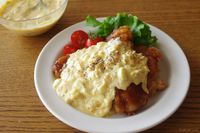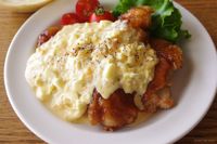 白い皿に盛り付けた甘酢チキンのタルタルかけ