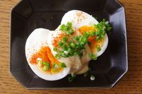 黒い皿にのせたピリ辛味噌ディップのゆで卵