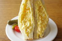 白い皿に盛り付けたたっぷり卵のサンドイッチ