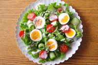 白い皿に盛り付けたゆで卵をトッピングしたグリーンサラダ