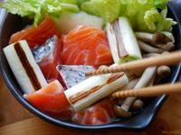 鮭と焼いた長ネギなどが鍋に入っている