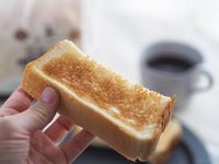 トーストした究極のしっとりもっちり食パンを手で持つ様子