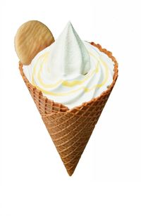 ワッフルコーンに入り、上から練乳がかかったソフトクリーム