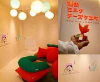 ソフトクリームとチーズと、パックに入った牛乳がテーブルに置かれている