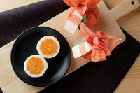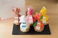 白、オレンジ、ピンクなど5種類の紙に包まれた丸いケーキが黒いトレーの上に乗っている