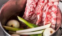 鍋に入れられた鶏がらや豚骨、ねぎなどの出汁の材料