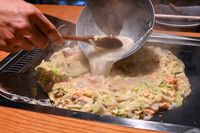 KOBOREYA 月島のこぼれや海鮮クリームもんじゃをはがしですくっているところ