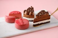 白いおさらの上にチョコレートケーキと丸いピンクのケーキが2つずつのっている