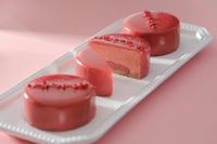 白いおさらの上にピンク色の小さくて丸いケーキが3のっている