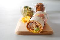 木のプレートにチキンが入った丸く巻かれたサラダラップとチーズなどがのっている