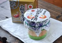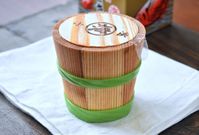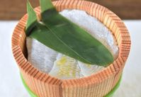 小皿ののせた小鯛ささ漬け、パッケージの樽、紙箱