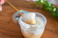 ローソンのプークリム -ふわとろクリームプリン-をスプーンですくっているところ