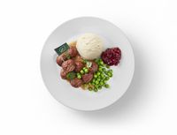 おさらの上にミートボールとマッシュポテト、エンドウ豆がのっている