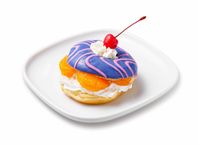 おさらの上に紫色のドーナツにホイップとみかんがサンドされてのっている