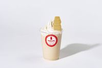アイスのカップの中にソフトクリームとヤクルトの形をしたクッキーが入って置いてある