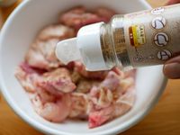 鶏肉にアウスパを振りかけている様子