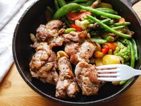 スキレットに入ったチキンをフォークで刺している様子